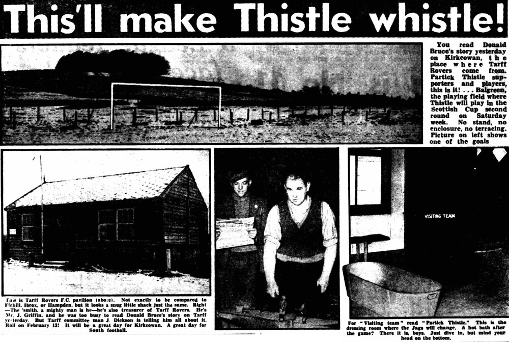 On this day 1954, with bugles, bells and beer, the Jags fans invaded Kirkcowan and made merry. It was a farcical Scottish Cup affair in the mud, with 10 goals in the final tally up... read the full story π Sat-13-Feb-1954 Tarff Rovers 1 Partick Thistle 9 (Scottish Cup 2nd Round) β