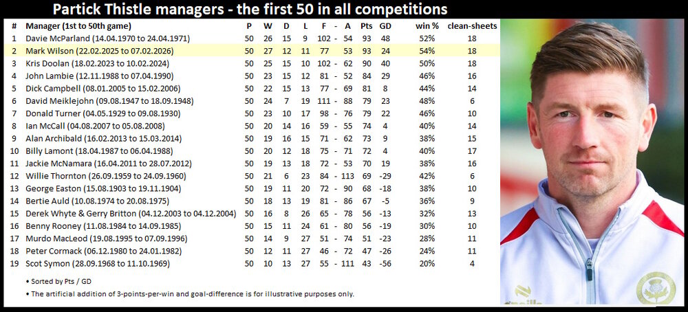 A packed-out 7-tab match hub now in place, check it out... Elgin City archived β HIT THE NORTH β Elgin City become the 150th club to meet Partick Thistle in competitive action, and in Thistle's 150th playing anniversary year too! β Amazingly, Elgin is only the 18th most northerly village/town/city to host Partick Thistle. The most northerly in Scotland is Fivepenny in the Outer Hebrides where Thistle played Ness on 4th August 1990. Norway and Sweden have all 10 places in the Top 10. The most northerly of all is the beautiful and historic city of GΓ€vle, where Thistle met BrynΓ€s on 26th July 1972. β Borough Briggs becomes the second most northerly venue to host Partick Thistle in the Scottish Cup. According to the precise post-codes, it's just 900 metres south of Deveronvale's Princess Royal Park on the latitude lines! β It's a bit of history for Robbie Crawford, forever Thistle's first-ever scorer vs. Elgin City in competitive action. β For the first time since January 1997, Thistle are awarded a penalty in a third successive match. The club-record (5) was set in August 1906. β It's only the 7th of February, but 5 Thistle penalties in 2026 (well done Alex!) already betters each of the last two whole calendar years. β Tony Watt becomes the second Jag to hit double figures in competitive goal action this term. β Aidan Fitzpatrick hits 12 assists for the season, matching Chris Erskine (2012-13) and Jack McMillan (2022-23). All eyes on the tally of 14 (the highest since records began in 2012-13) set by Kyle Turner in 2022-23. β Manager Mark Wilson reaches the 50 competitive games milestone as Thistle co-manager / manager. His 54% win rate is the highest of all-time at this stage; see graphic below for full details. β Thistle reach the Scottish Cup Quarter Finals for the 34th time. β The class of 2025-26 become the first Thistle team since 1982-83 to qualify for the Quarter Finals of both the League Cup & Scottish Cup in the same season. Somewhat bizarrely, Thistle have been a second tier club on both occasions!