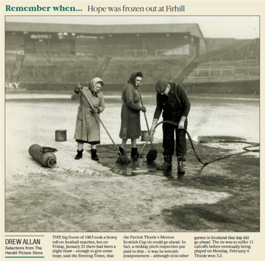 Auld Jag Posted February 17 Report Share Posted February 17 1 hour ago, The Thistle Archive said: Nice wee Herald snip published today, based on the night when the Jags (temporarily) came out of the deep freeze... match hub expanded today with cuttings and pictures... Mon-04-Feb-1963 Partick Thistle 3 Morton 2 (Scottish Cup 1st Round) → Mop and bucket to clear the pitch. Quote Link to comment Share on other sites More sharing options...