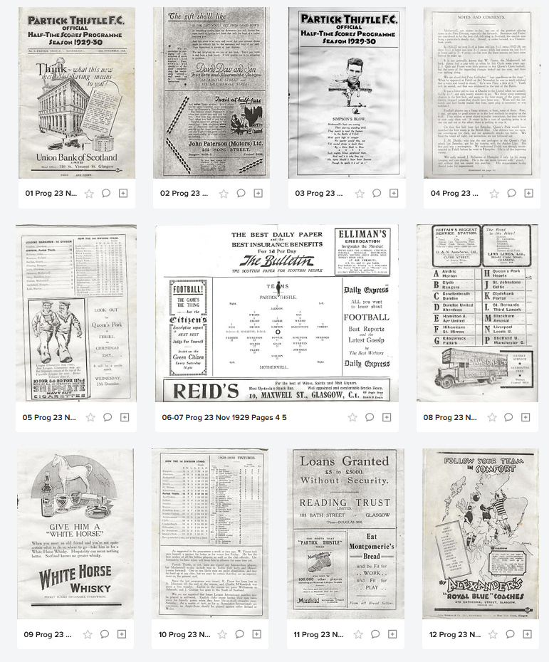 The Thistle Archive Posted February 27 Author Report Share Posted February 27 We were fascinated to receive scans of the full 12 page match programme for the Motherwell game on 23 November 1929, with thanks to John Simpson's son, John. The fully scanned programme is now uploaded to our flickr site. A link to the flickr site is also included in the 'Scrapbook' tab for the Well game on the Archive which has been extended today with further press cuttings from the game itself. It's hard to stitch together the history of the match programmes of Scottish clubs, certainly sporadic pre WW2. Thanks to John we can now see that PTFC had a series in 1929-30. The 8th league game of the season vs. Well was also edition 8 of the programme, so it looks like that tells the story. Celtic and Killie started issuing that season too, although the latter had also done so back in 1899-00. Would be interesting to hear about the history of the programmes in the Scottish game. Was 1929-30 the first season for Thistle home programmes? Was the match programme a permanent fixture from then on, or was there a gap until it became a staple after the war? It's not much, but this brings us up to 49 fully scanned programmes at your fingertips for a flick through. Our list page has been restyled today, giving you a convenient overview of how to quickly access all 49 of them: Fully scanned programmes → 1 Quote Link to comment Share on other sites More sharing options...