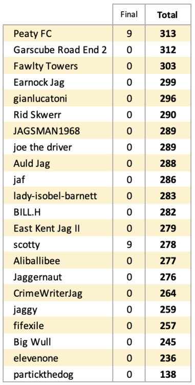 BowenBoys Posted August 15, 2021 Report Share Posted August 15, 2021 Scottish Cup Pop Up 2020/21 113 TEAMS / 112 MATCHES / 9 ROUNDS / 267 DAYS The world's most popular sports prediction competition is back. For the first time ever I've got my act together in time to capture every single match of this season's Scottish Cup. Can Auld Jag repeat his success of last season? Will jaggy produce a repeat of his last gasp Euro's victory? Or are you a champion in waiting? Select the teams that will make it through to the next round. In the early rounds you can freely select any team. From Round 5 you can only select teams that you picked in the previous round. Selection Points One point for each correct selection in the Preliminary Round. This will increase by one point in each successive round. Therefore, a correct selection in the Final is worth nine points. Seeding Points Teams are seeded according to the league that they play in. There are 6 groups - Premiership; Championship; League One; League Two; Highland/Lowland leagues; East of Scotland/South of Scotland/West of Scotland/North Caledonian & SJFA leagues. Additional points will be awarded if your selected team knocks out a team from a higher group. This will come into effect in Round 1. 1 Quote Link to comment Share on other sites More sharing options...