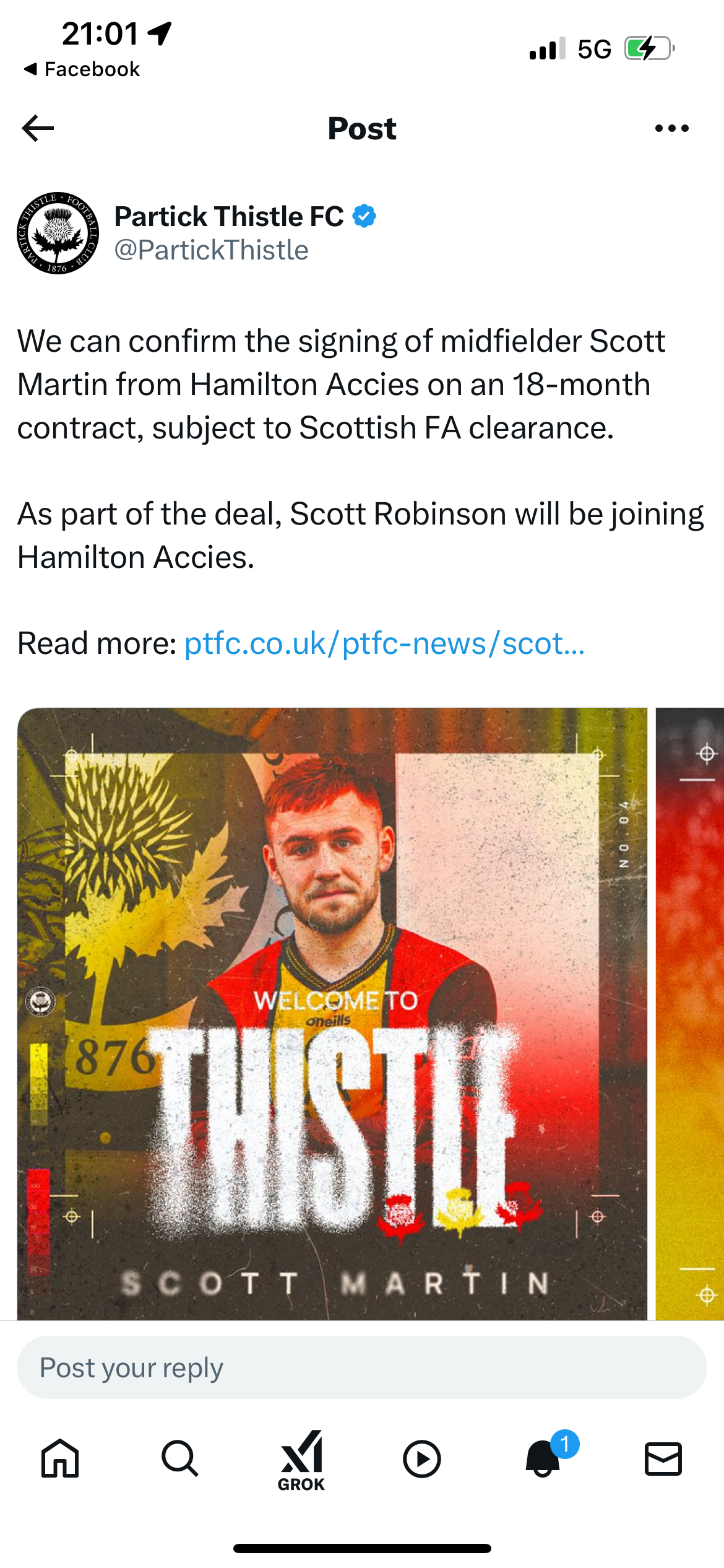 Jaggernaut Posted February 3, 2025 Report Share Posted February 3, 2025 3 hours ago, The Legend Blows said: https://hamiltonacciesfc.co.uk/scott-martin-departs-hamilton-accies/ I noticed the distinct lack of any of the usual phrases about the departure (e.g., "has been released," or "by mutual consent"...). Maybe he was on something like a monthly contract? Maybe he was eagerly "told" he could go? Quote Link to comment Share on other sites More sharing options...