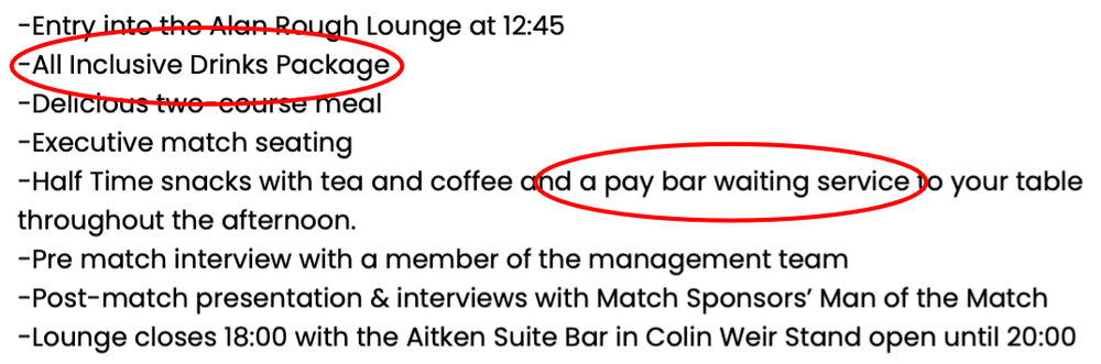jaggy Posted November 13 Report Share Posted November 13 1 hour ago, Norgethistle said: £70 for a 1 course meal +match ticket!!! Even 2 for £120 is too steep for 1 plate of food at a midweek match (or even a Saturday match) No season ticket discount as far as I can see, not that I’d consider £50 plus for a main course & a pint in any case Quote Link to comment Share on other sites More sharing options...