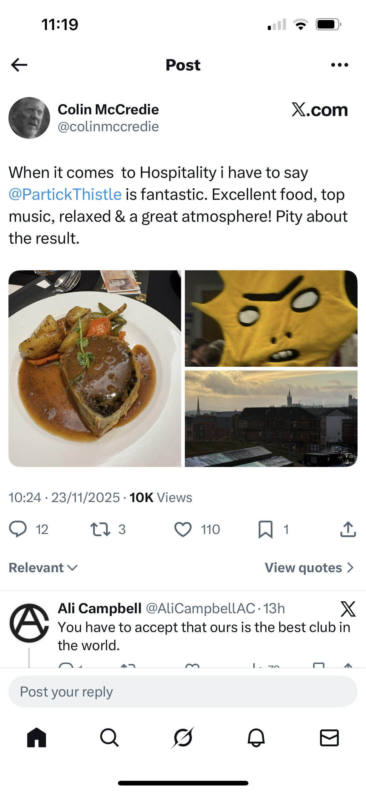 thornwoodjag Posted November 4 Report Share Posted November 4 1 hour ago, Third Lanark said: Yeah its gutting mate. We will need to try for our third hospitality attempt of the season in 2026, im thinking possibly the Arbroath game on 28th February as i don think there are scotland games scheduled for that weekend and it might be a game less likely to be moved for TV than other ones (though i have no idea really), but again will need to see if it suits others in my group. But we are definetly not going to be able to enjoy the hospitality in 2025 as to many things clashing for others in my group in the remaining period of 2025 A possible TJF take over hospitality day. Quote Link to comment Share on other sites More sharing options...